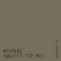 Цвет #75705C в цветовой модели RGB обозначается тремя октетами (117, 112, 92) в десятичном формате и #75705C в шестнадцатиричном (hex) формате, которые являются интенсивностью красного 117 (hex 75), интенсивность зелёного 112 (hex 70) и интенсивность синего 92 (hex 5C).