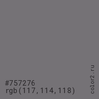Цвет #757276 в цветовой модели RGB обозначается тремя октетами (117, 114, 118) в десятичном формате и #757276 в шестнадцатиричном (hex) формате, которые являются интенсивностью красного 117 (hex 75), интенсивность зелёного 114 (hex 72) и интенсивность синего 118 (hex 76).