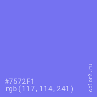 Цвет #7572F1 в цветовой модели RGB обозначается тремя октетами (117, 114, 241) в десятичном формате и #7572F1 в шестнадцатиричном (hex) формате, которые являются интенсивностью красного 117 (hex 75), интенсивность зелёного 114 (hex 72) и интенсивность синего 241 (hex F1).