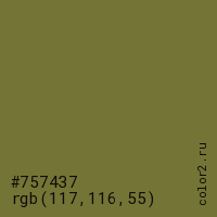 Цвет #757437 в цветовой модели RGB обозначается тремя октетами (117, 116, 55) в десятичном формате и #757437 в шестнадцатиричном (hex) формате, которые являются интенсивностью красного 117 (hex 75), интенсивность зелёного 116 (hex 74) и интенсивность синего 55 (hex 37).
