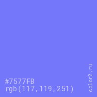 Цвет #7577FB в цветовой модели RGB обозначается тремя октетами (117, 119, 251) в десятичном формате и #7577FB в шестнадцатиричном (hex) формате, которые являются интенсивностью красного 117 (hex 75), интенсивность зелёного 119 (hex 77) и интенсивность синего 251 (hex FB).