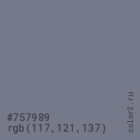 Цвет #757989 в цветовой модели RGB обозначается тремя октетами (117, 121, 137) в десятичном формате и #757989 в шестнадцатиричном (hex) формате, которые являются интенсивностью красного 117 (hex 75), интенсивность зелёного 121 (hex 79) и интенсивность синего 137 (hex 89).