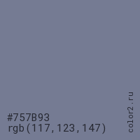 Цвет #757B93 в цветовой модели RGB обозначается тремя октетами (117, 123, 147) в десятичном формате и #757B93 в шестнадцатиричном (hex) формате, которые являются интенсивностью красного 117 (hex 75), интенсивность зелёного 123 (hex 7B) и интенсивность синего 147 (hex 93).