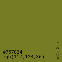 Цвет #757C24 в цветовой модели RGB обозначается тремя октетами (117, 124, 36) в десятичном формате и #757C24 в шестнадцатиричном (hex) формате, которые являются интенсивностью красного 117 (hex 75), интенсивность зелёного 124 (hex 7C) и интенсивность синего 36 (hex 24).
