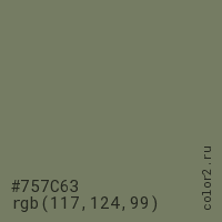 Цвет #757C63 в цветовой модели RGB обозначается тремя октетами (117, 124, 99) в десятичном формате и #757C63 в шестнадцатиричном (hex) формате, которые являются интенсивностью красного 117 (hex 75), интенсивность зелёного 124 (hex 7C) и интенсивность синего 99 (hex 63).