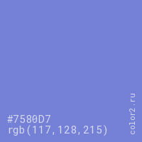 Цвет #7580D7 в цветовой модели RGB обозначается тремя октетами (117, 128, 215) в десятичном формате и #7580D7 в шестнадцатиричном (hex) формате, которые являются интенсивностью красного 117 (hex 75), интенсивность зелёного 128 (hex 80) и интенсивность синего 215 (hex D7).