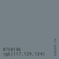 Цвет #758186 в цветовой модели RGB обозначается тремя октетами (117, 129, 134) в десятичном формате и #758186 в шестнадцатиричном (hex) формате, которые являются интенсивностью красного 117 (hex 75), интенсивность зелёного 129 (hex 81) и интенсивность синего 134 (hex 86).