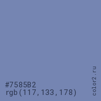 Цвет #7585B2 в цветовой модели RGB обозначается тремя октетами (117, 133, 178) в десятичном формате и #7585B2 в шестнадцатиричном (hex) формате, которые являются интенсивностью красного 117 (hex 75), интенсивность зелёного 133 (hex 85) и интенсивность синего 178 (hex B2).