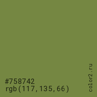 Цвет #758742 в цветовой модели RGB обозначается тремя октетами (117, 135, 66) в десятичном формате и #758742 в шестнадцатиричном (hex) формате, которые являются интенсивностью красного 117 (hex 75), интенсивность зелёного 135 (hex 87) и интенсивность синего 66 (hex 42).