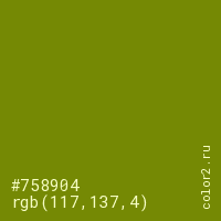 Цвет #758904 в цветовой модели RGB обозначается тремя октетами (117, 137, 4) в десятичном формате и #758904 в шестнадцатиричном (hex) формате, которые являются интенсивностью красного 117 (hex 75), интенсивность зелёного 137 (hex 89) и интенсивность синего 4 (hex 04).