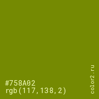 Цвет #758A02 в цветовой модели RGB обозначается тремя октетами (117, 138, 2) в десятичном формате и #758A02 в шестнадцатиричном (hex) формате, которые являются интенсивностью красного 117 (hex 75), интенсивность зелёного 138 (hex 8A) и интенсивность синего 2 (hex 02).