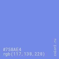 Цвет #758AE4 в цветовой модели RGB обозначается тремя октетами (117, 138, 228) в десятичном формате и #758AE4 в шестнадцатиричном (hex) формате, которые являются интенсивностью красного 117 (hex 75), интенсивность зелёного 138 (hex 8A) и интенсивность синего 228 (hex E4).