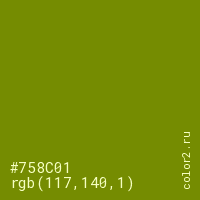 Цвет #758C01 в цветовой модели RGB обозначается тремя октетами (117, 140, 1) в десятичном формате и #758C01 в шестнадцатиричном (hex) формате, которые являются интенсивностью красного 117 (hex 75), интенсивность зелёного 140 (hex 8C) и интенсивность синего 1 (hex 01).
