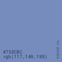 Цвет #758CBC в цветовой модели RGB обозначается тремя октетами (117, 140, 188) в десятичном формате и #758CBC в шестнадцатиричном (hex) формате, которые являются интенсивностью красного 117 (hex 75), интенсивность зелёного 140 (hex 8C) и интенсивность синего 188 (hex BC).