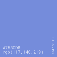Цвет #758CDB в цветовой модели RGB обозначается тремя октетами (117, 140, 219) в десятичном формате и #758CDB в шестнадцатиричном (hex) формате, которые являются интенсивностью красного 117 (hex 75), интенсивность зелёного 140 (hex 8C) и интенсивность синего 219 (hex DB).