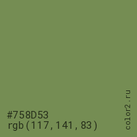Цвет #758D53 в цветовой модели RGB обозначается тремя октетами (117, 141, 83) в десятичном формате и #758D53 в шестнадцатиричном (hex) формате, которые являются интенсивностью красного 117 (hex 75), интенсивность зелёного 141 (hex 8D) и интенсивность синего 83 (hex 53).