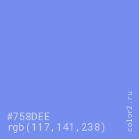 Цвет #758DEE в цветовой модели RGB обозначается тремя октетами (117, 141, 238) в десятичном формате и #758DEE в шестнадцатиричном (hex) формате, которые являются интенсивностью красного 117 (hex 75), интенсивность зелёного 141 (hex 8D) и интенсивность синего 238 (hex EE).