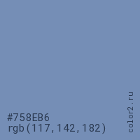 Цвет #758EB6 в цветовой модели RGB обозначается тремя октетами (117, 142, 182) в десятичном формате и #758EB6 в шестнадцатиричном (hex) формате, которые являются интенсивностью красного 117 (hex 75), интенсивность зелёного 142 (hex 8E) и интенсивность синего 182 (hex B6).