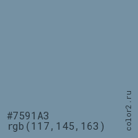 Цвет #7591A3 в цветовой модели RGB обозначается тремя октетами (117, 145, 163) в десятичном формате и #7591A3 в шестнадцатиричном (hex) формате, которые являются интенсивностью красного 117 (hex 75), интенсивность зелёного 145 (hex 91) и интенсивность синего 163 (hex A3).
