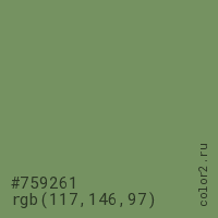 Цвет #759261 в цветовой модели RGB обозначается тремя октетами (117, 146, 97) в десятичном формате и #759261 в шестнадцатиричном (hex) формате, которые являются интенсивностью красного 117 (hex 75), интенсивность зелёного 146 (hex 92) и интенсивность синего 97 (hex 61).
