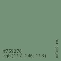 Цвет #759276 в цветовой модели RGB обозначается тремя октетами (117, 146, 118) в десятичном формате и #759276 в шестнадцатиричном (hex) формате, которые являются интенсивностью красного 117 (hex 75), интенсивность зелёного 146 (hex 92) и интенсивность синего 118 (hex 76).