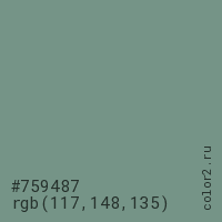 Цвет #759487 в цветовой модели RGB обозначается тремя октетами (117, 148, 135) в десятичном формате и #759487 в шестнадцатиричном (hex) формате, которые являются интенсивностью красного 117 (hex 75), интенсивность зелёного 148 (hex 94) и интенсивность синего 135 (hex 87).