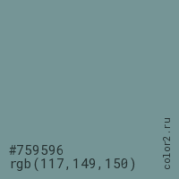 Цвет #759596 в цветовой модели RGB обозначается тремя октетами (117, 149, 150) в десятичном формате и #759596 в шестнадцатиричном (hex) формате, которые являются интенсивностью красного 117 (hex 75), интенсивность зелёного 149 (hex 95) и интенсивность синего 150 (hex 96).