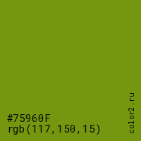 Цвет #75960F в цветовой модели RGB обозначается тремя октетами (117, 150, 15) в десятичном формате и #75960F в шестнадцатиричном (hex) формате, которые являются интенсивностью красного 117 (hex 75), интенсивность зелёного 150 (hex 96) и интенсивность синего 15 (hex 0F).