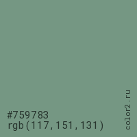 Цвет #759783 в цветовой модели RGB обозначается тремя октетами (117, 151, 131) в десятичном формате и #759783 в шестнадцатиричном (hex) формате, которые являются интенсивностью красного 117 (hex 75), интенсивность зелёного 151 (hex 97) и интенсивность синего 131 (hex 83).