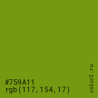 Цвет #759A11 в цветовой модели RGB обозначается тремя октетами (117, 154, 17) в десятичном формате и #759A11 в шестнадцатиричном (hex) формате, которые являются интенсивностью красного 117 (hex 75), интенсивность зелёного 154 (hex 9A) и интенсивность синего 17 (hex 11).