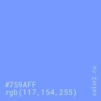 Цвет #759AFF в цветовой модели RGB обозначается тремя октетами (117, 154, 255) в десятичном формате и #759AFF в шестнадцатиричном (hex) формате, которые являются интенсивностью красного 117 (hex 75), интенсивность зелёного 154 (hex 9A) и интенсивность синего 255 (hex FF).