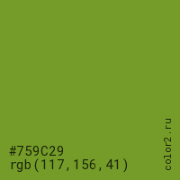 Цвет #759C29 в цветовой модели RGB обозначается тремя октетами (117, 156, 41) в десятичном формате и #759C29 в шестнадцатиричном (hex) формате, которые являются интенсивностью красного 117 (hex 75), интенсивность зелёного 156 (hex 9C) и интенсивность синего 41 (hex 29).