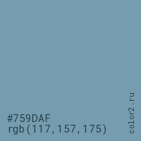Цвет #759DAF в цветовой модели RGB обозначается тремя октетами (117, 157, 175) в десятичном формате и #759DAF в шестнадцатиричном (hex) формате, которые являются интенсивностью красного 117 (hex 75), интенсивность зелёного 157 (hex 9D) и интенсивность синего 175 (hex AF).