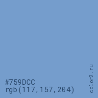 Цвет #759DCC в цветовой модели RGB обозначается тремя октетами (117, 157, 204) в десятичном формате и #759DCC в шестнадцатиричном (hex) формате, которые являются интенсивностью красного 117 (hex 75), интенсивность зелёного 157 (hex 9D) и интенсивность синего 204 (hex CC).