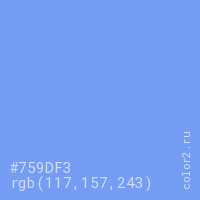 Цвет #759DF3 в цветовой модели RGB обозначается тремя октетами (117, 157, 243) в десятичном формате и #759DF3 в шестнадцатиричном (hex) формате, которые являются интенсивностью красного 117 (hex 75), интенсивность зелёного 157 (hex 9D) и интенсивность синего 243 (hex F3).