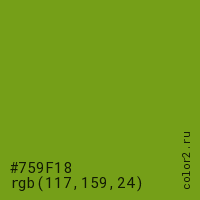 Цвет #759F18 в цветовой модели RGB обозначается тремя октетами (117, 159, 24) в десятичном формате и #759F18 в шестнадцатиричном (hex) формате, которые являются интенсивностью красного 117 (hex 75), интенсивность зелёного 159 (hex 9F) и интенсивность синего 24 (hex 18).