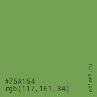 Цвет #75A154 в цветовой модели RGB обозначается тремя октетами (117, 161, 84) в десятичном формате и #75A154 в шестнадцатиричном (hex) формате, которые являются интенсивностью красного 117 (hex 75), интенсивность зелёного 161 (hex A1) и интенсивность синего 84 (hex 54).