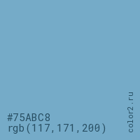 Цвет #75ABC8 в цветовой модели RGB обозначается тремя октетами (117, 171, 200) в десятичном формате и #75ABC8 в шестнадцатиричном (hex) формате, которые являются интенсивностью красного 117 (hex 75), интенсивность зелёного 171 (hex AB) и интенсивность синего 200 (hex C8).