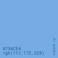 Цвет #75ACE4 в цветовой модели RGB обозначается тремя октетами (117, 172, 228) в десятичном формате и #75ACE4 в шестнадцатиричном (hex) формате, которые являются интенсивностью красного 117 (hex 75), интенсивность зелёного 172 (hex AC) и интенсивность синего 228 (hex E4).