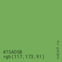 Цвет #75AD5B в цветовой модели RGB обозначается тремя октетами (117, 173, 91) в десятичном формате и #75AD5B в шестнадцатиричном (hex) формате, которые являются интенсивностью красного 117 (hex 75), интенсивность зелёного 173 (hex AD) и интенсивность синего 91 (hex 5B).