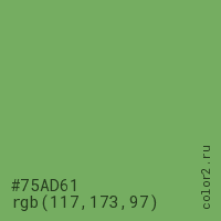 Цвет #75AD61 в цветовой модели RGB обозначается тремя октетами (117, 173, 97) в десятичном формате и #75AD61 в шестнадцатиричном (hex) формате, которые являются интенсивностью красного 117 (hex 75), интенсивность зелёного 173 (hex AD) и интенсивность синего 97 (hex 61).