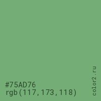 Цвет #75AD76 в цветовой модели RGB обозначается тремя октетами (117, 173, 118) в десятичном формате и #75AD76 в шестнадцатиричном (hex) формате, которые являются интенсивностью красного 117 (hex 75), интенсивность зелёного 173 (hex AD) и интенсивность синего 118 (hex 76).