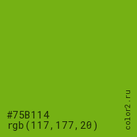 Цвет #75B114 в цветовой модели RGB обозначается тремя октетами (117, 177, 20) в десятичном формате и #75B114 в шестнадцатиричном (hex) формате, которые являются интенсивностью красного 117 (hex 75), интенсивность зелёного 177 (hex B1) и интенсивность синего 20 (hex 14).