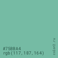 Цвет #75BBA4 в цветовой модели RGB обозначается тремя октетами (117, 187, 164) в десятичном формате и #75BBA4 в шестнадцатиричном (hex) формате, которые являются интенсивностью красного 117 (hex 75), интенсивность зелёного 187 (hex BB) и интенсивность синего 164 (hex A4).