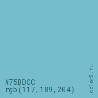 Цвет #75BDCC в цветовой модели RGB обозначается тремя октетами (117, 189, 204) в десятичном формате и #75BDCC в шестнадцатиричном (hex) формате, которые являются интенсивностью красного 117 (hex 75), интенсивность зелёного 189 (hex BD) и интенсивность синего 204 (hex CC).