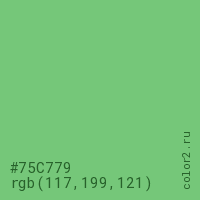 Цвет #75C779 в цветовой модели RGB обозначается тремя октетами (117, 199, 121) в десятичном формате и #75C779 в шестнадцатиричном (hex) формате, которые являются интенсивностью красного 117 (hex 75), интенсивность зелёного 199 (hex C7) и интенсивность синего 121 (hex 79).