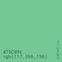 Цвет #75C896 в цветовой модели RGB обозначается тремя октетами (117, 200, 150) в десятичном формате и #75C896 в шестнадцатиричном (hex) формате, которые являются интенсивностью красного 117 (hex 75), интенсивность зелёного 200 (hex C8) и интенсивность синего 150 (hex 96).