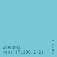 Цвет #75C8D4 в цветовой модели RGB обозначается тремя октетами (117, 200, 212) в десятичном формате и #75C8D4 в шестнадцатиричном (hex) формате, которые являются интенсивностью красного 117 (hex 75), интенсивность зелёного 200 (hex C8) и интенсивность синего 212 (hex D4).