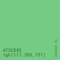 Цвет #75CB83 в цветовой модели RGB обозначается тремя октетами (117, 203, 131) в десятичном формате и #75CB83 в шестнадцатиричном (hex) формате, которые являются интенсивностью красного 117 (hex 75), интенсивность зелёного 203 (hex CB) и интенсивность синего 131 (hex 83).