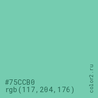 Цвет #75CCB0 в цветовой модели RGB обозначается тремя октетами (117, 204, 176) в десятичном формате и #75CCB0 в шестнадцатиричном (hex) формате, которые являются интенсивностью красного 117 (hex 75), интенсивность зелёного 204 (hex CC) и интенсивность синего 176 (hex B0).